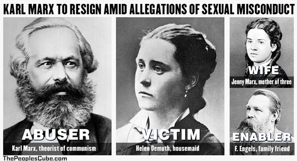 Marx continued, "As a white cisgendered heterosexual male, I have cheated on my wife, sexually assaulted my subordinate, and otherwise abused my power and privilege to hurt and victimize women. I therefore feel that I no longer have the right, nor the moral authority to defend my philosophy of class victimization, to incite class hatred, provoke violent anti-bourgeois revolutions, and establish proletarian dictatorships."